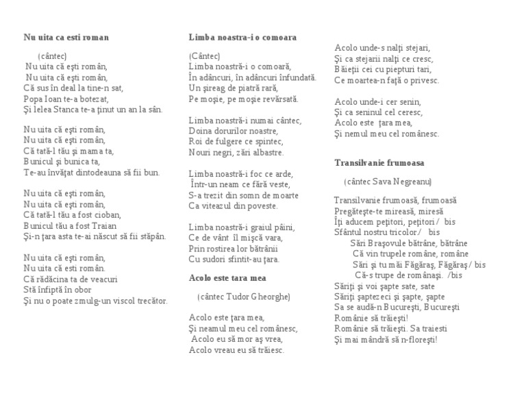 Acolo unde s nalţi stejari şi ca stejarii nalţi îmi cresc flăcăi cu piepturile tari ce moartea n faţă o privesc. Ajută ne doamne să ajungem acolo. Acolo mi sunt și frații bătrânii mei părinți ca două mori de vânt. Acolo unde intalnesti cat tine tara n lung si n lat batrane versuri us urme vitejesti si osul celor ce au luptat.