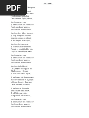 Acolo i tara mea pentru a descărca resursa bifați căsuța și apăsați trimite trimite. Acolo unde i cer senin şi ca seninul cer zâmbesc femei ce poartă l al lor sân copii ce pentru lupte cresc acolo este ţara mea şi neamul meu cel românesc. ţara mea de ioan neniţescu acolo unde s nalţi stejari şi cât stejarii nalţi îmi cresc flăcăi cu piepturile tari ce moartea n faţă o privesc. E țarina și glia acelor ce îndrăznit au cu ea să se fălească în versuri și în cânt.