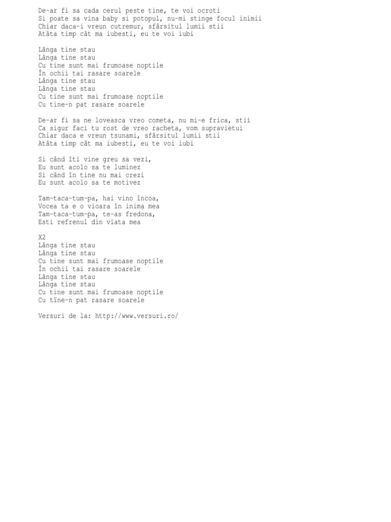 De ar fi sa cada cerul peste tine te voi ocroti si poate sa vina baby si potopul nu mi stinge focul inimii chiar daca i vre un cutremur sfarsitul lumii stii atata timp cat ma iubesti eu te voi iubii langa tine stau langa tine stau cu tine sunt mai frumoase noptile in ochii tai rasare.