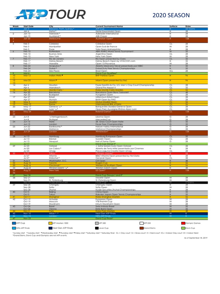 Here is the atp calendar for 2019. The full 2020 atp tour calendar can be viewed here. The atp has released the 2019 atp world tour calendar a tournament schedule that will feature 63 tournaments in 31 countries across six continents in addition to the four grand slams. The official schedule for 2020 atp world tour has been released by the atp itself a few days ago with australian open tennis 2020 dates and french open 2010 dates.