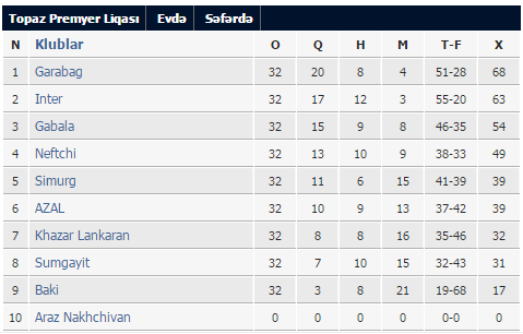 Tables team mp w d l f a d p last 5 matches. The menu options allow displaying more azerbaidjan premier league tables and results. Azerbaijan premier league league table live results fixtures statistics current form top scorers squad yellow cards. Azerbaijan premier league 2020 2021 table full stats livescores.