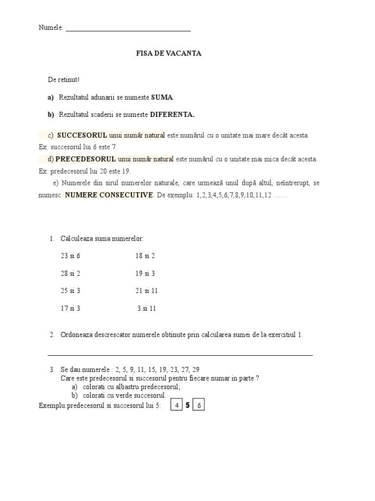 Numerele 1 și 2 sunt consecutive adică sunt unul după altul. Succesor inseamna cel care urmeaza si predecesor cel din urma adica succesorul numarului 54 este 55 pentru ca dupa 54 urmeaza 55 iar predecesorul numarului 54 este 53 pentru ca 53 este inainte de 54. De exemplu predecesorul lui 846 este 845. Succesorul e cel care urmeaza iar predecesorul e cel dinapoi cel anterior.