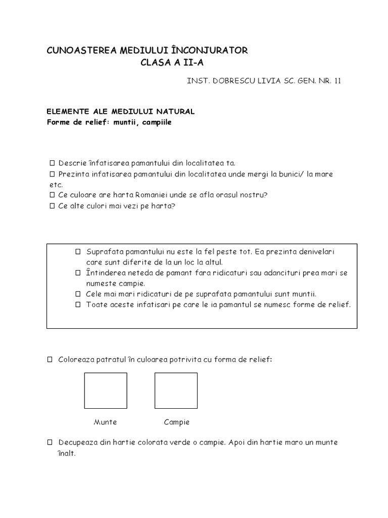 Ce fel de forme de relief sunt muntii. Cele mai cunoscute forme de relief sunt muntele dealul câmpia numită și șes valea depresiunea și podișul. în geografie sensul reliefului se referă la setul de forme care ies în crusta pământului concepute sub acțiunea forțelor interne și externe numite agenți de relief. Relieful este un tip de înălțime o neregularitate care se evidențiază pe o suprafață.