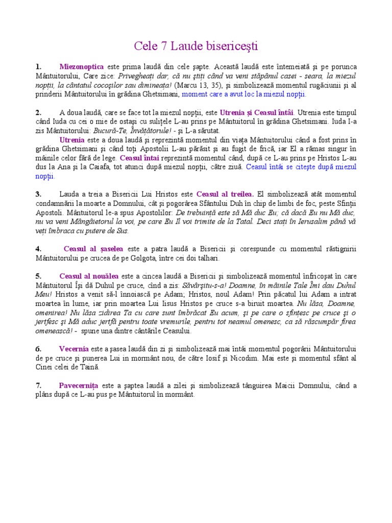 Cele 7 laude pdf. Seara şi dimineaţa şi la amiază mă voi ruga şi voi striga şi el va auzi glasul meu ps. Care sunt cele 10 porunci cele 7 laude cele 7 taine ale sfintei bisencl cele 12 articole ale crezului cele 9 porunci ale sfintei biserici. Pr andrei atudori a răspuns. Utrenia şi ceasul i se socotesc de fapt ca fiind o singură laudă astfel ajungîndu se la numărul de 7 laude.