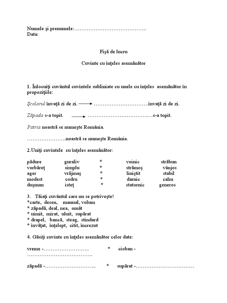 Cuvinte cu inteles asemanator. Directoare web 2009 dictionar cc 2009 dictionar cc. Generator de anagrame romana romana extinsa. O fisa de lucru cu exercitii diversificate pentru consolidarea notiunilor de sens asemnator si sens opus ale cuvintelor. Nor de cuvinte populare recente.