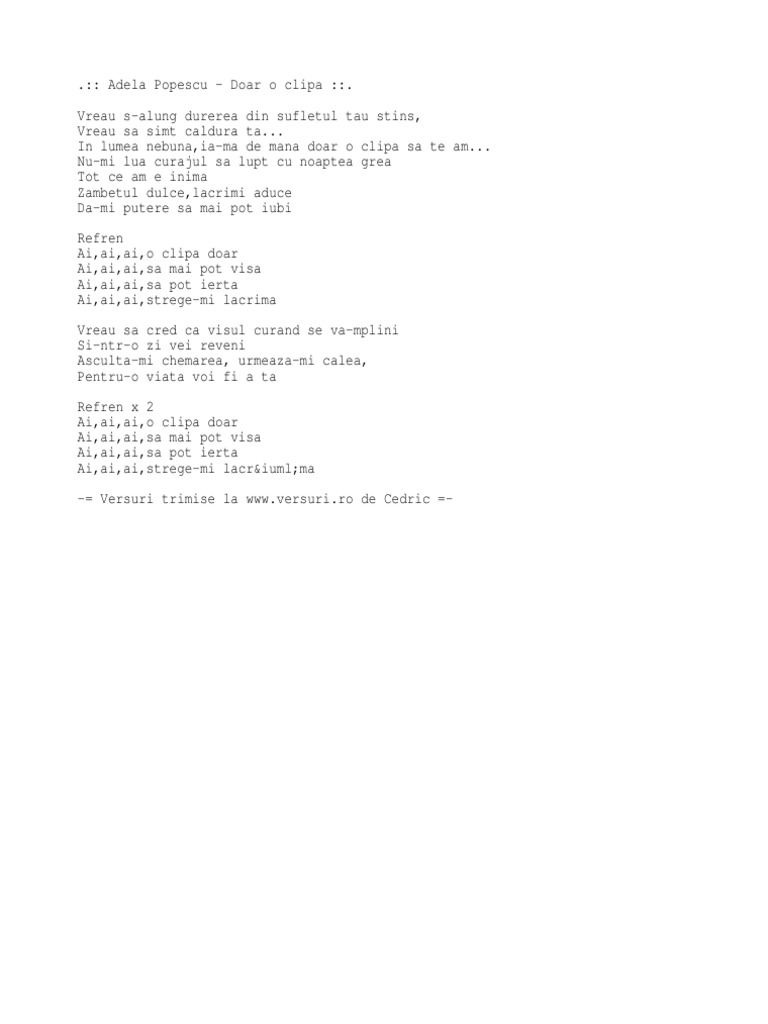 Numai pentru tine am plans de fericire versuri adela popescu o o 9 zi in al 9 lea cer versuri adela popescu o clipa versuri adela popescu o clipa corect versuri adela popescu o clipa varianta corecta versuri adela popescu o iubire ca n filme versuri adela popescu o lacrima versuri adela popescu o lume de straini versuri. Undeva imaginea ta o vad dar stiu ca i prea tarziu. Doar o clipa de pleci lacrimi reci am sa vars ooof iuubire fac tot ce vrei orice pentru tine si mor de dor doar o clipa de pleci lacrimi reci am sa vars ooof iuubire. De vreo ispită îmi chinuie gândul şi ca profetul pe piatră adorm.