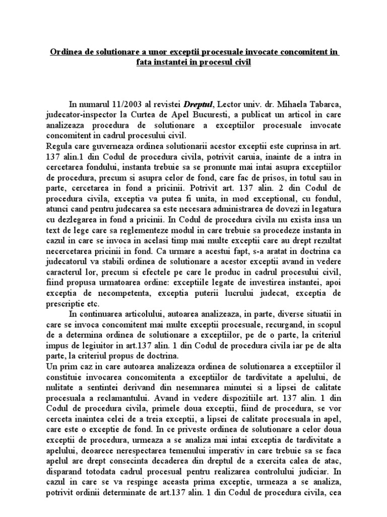 1 teza i ncpc. Astfel exceptia procesuala este definita de codul de procedura civila in articolul 245 ca fiind mijlocul prin care pot fi invocate neregularitati procedurale fara insa a se discuta fondul dreptului.
