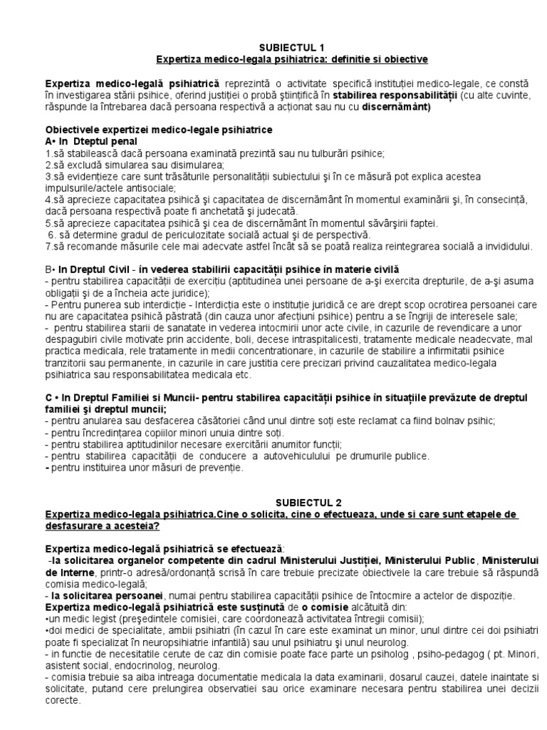 Expertiza medico legala psihiatrica isi are utilitatea in mai multe ramuri ale dreptului efectuandu se in urmatoarele situatii. 3 expertiza medico legală psihiatrică se efectuează după obţinerea consimţământului scris al persoanei ce urmează a fi supusă expertizei exprimat în prezenţa unui avocat ales sau din oficiu în faţa organului judiciar iar în cazul minorului şi în prezenţa ocrotitorului legal. 4 expertiza medico legală psihiatrica se efectuează numai pentru o anumită fapta sau circumstanță având ca obiective principale stabilirea capacității psihice la momentul comiterii unei fapte prevăzute de legea penală sau al exercitării unui drept a capacității psihice la momentul examinării și aprecieri asupra periculozitatii sociale și necesității instituirii măsurilor de siguranță cu caracter medical. In concluzie expertiza medico legala psihiatrica este o lucrare ampla de analiza si sinteza a tuturor trasaturilor psihopatologice ale infractorului privind modul si conditiile exacte de savirsire a faptei in scopul stabilirii discernământului si de a oferi justitiei criterii medicale obiective menite sa duca la soluţionarea justa a cauzei aplicarea si dozarea unei pedepse corespunzatoare cât si instituirea unor masuri de siguranta cu caracter medical privind viitorul bolnavului si.