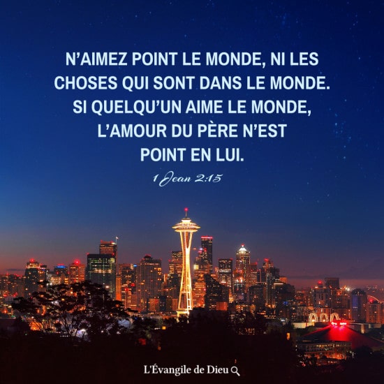 Si quelqu un aime le monde l amour du père n est pas en lui. 15 n aimez point le monde ni les choses qui sont dans le monde. Si quelqu un aime le monde l amour du père n est point en lui. 16 car tout ce qui est dans le monde la convoitise de la chair la convoitise des yeux et l orgueil de la vie ne vient point du père mais vient du monde.