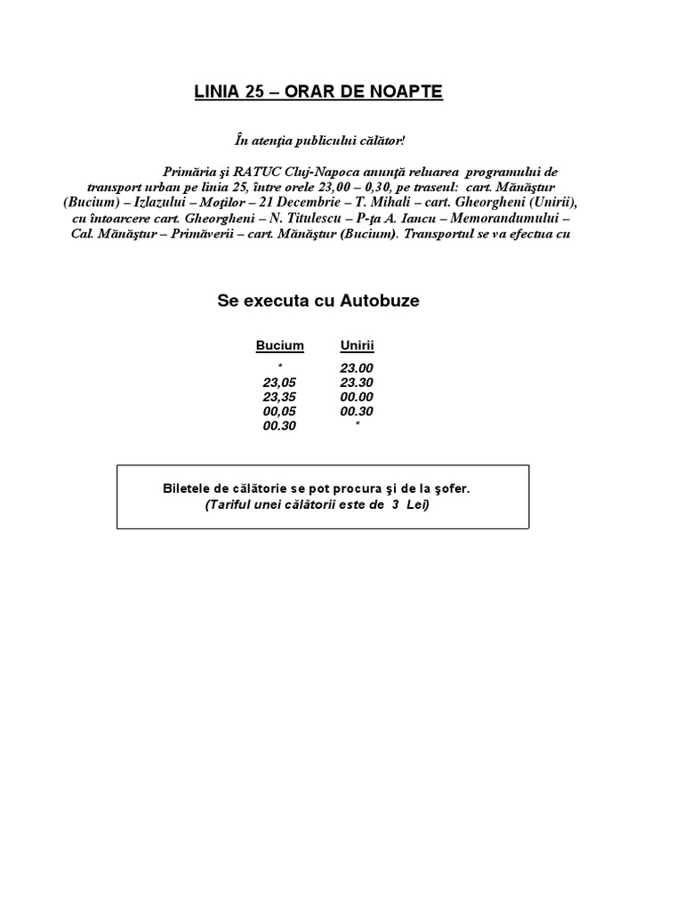 Lucrez la o firma de paza din 5 04 2015 lucrez si de noapte pana in data de 19 08 2015 cand firma fujikura din cluj sa schimbat programul de lucru la 12 ore iar noi am ramas tot la programul de lucru de 8 ore pe zi mentionez ca programul securitati din interior lucra si lucreaza la 12 ore numai pe noi patronul nu vrea ca sa ne schimbe programul. Linia 41 livada postei stupini lujerului. Hartă linia 25. Salut atunci cand pierzi notiunea timpului la bere si transportul de noapte e singura solutie sa ajungi acasa poti sa stai linistit nu trebuie sa mai cauti pe siteul ratb ului pdf uri cu programul autobuzelor sa te intrebi daca mai sunt de actualitate sau sa trebuiasca sa aflii care e autobuzul de care ai nevoie acum poti folosi aplicatia transport de noapte ratb ce poate fi.