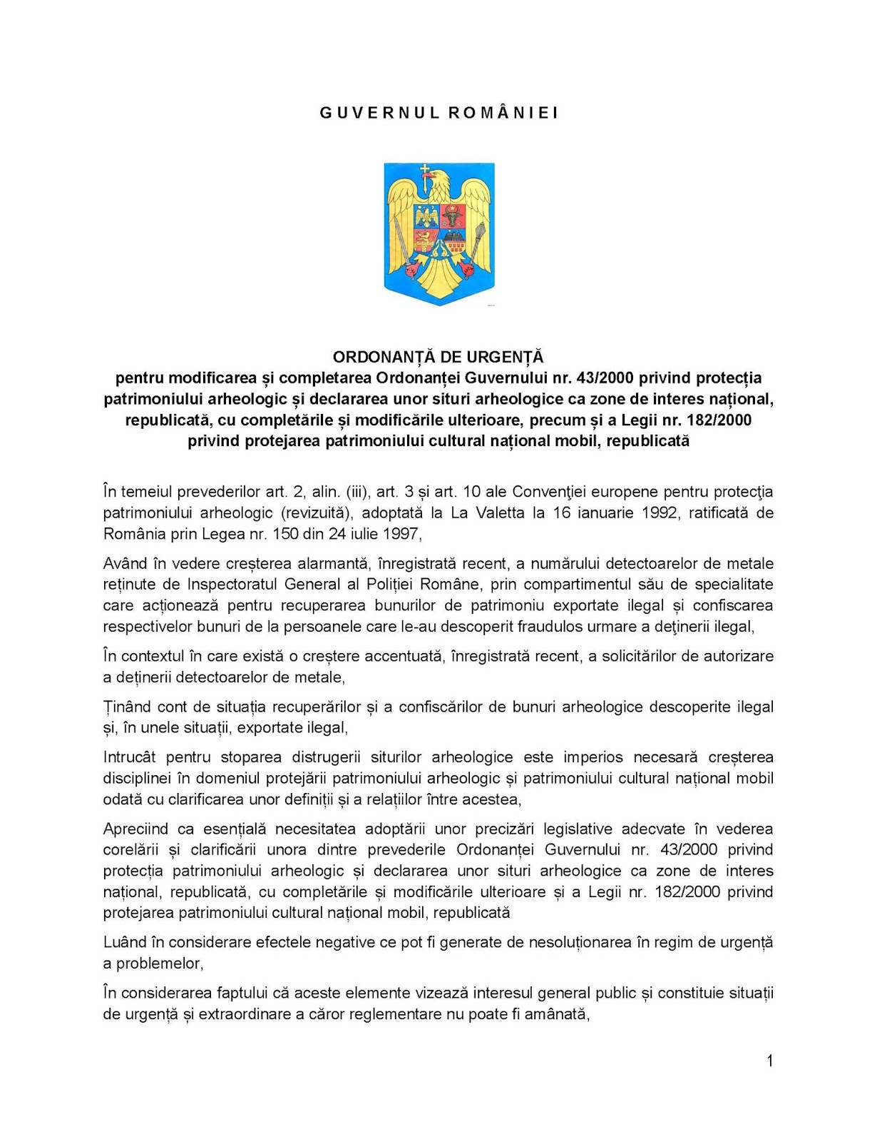 Ordonanå äƒ pentru protejarea patrimoniului arheologic. 1 produsele achiziționate de către ministerul fondurilor europene în calitate de beneficiar al programului operațional ajutorarea persoanelor defavorizate în cadrul măsurii precaritate materială constând în lipsa produselor de igienă nedistribuite destinatarilor finali conform mecanismului prevăzut de hotărârea guvernului nr. Pagina web oficială a guvernului româniei. 43 2000 privind protecția patrimoniului arheologic și declararea unor situri arheologice ca zone de interes național modificări 4 puneri în aplicare 2 respingeri de neconstituționalitate 2 referințe 5 derogări 4 reviste 3 jurisprudență relevantă referințe în jurisprudență.