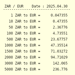 View zar rates table. 1 00 zar 0 05130 0 eur. Convert south african rand to euro with flexible currency converter also check south african rand to euro exchange rate which is changing every second and may be impacted of everyday political or economic life zar to eur currency pair can change anytime and may be difficult to predict the future. 1 zar 0 05130 eur.