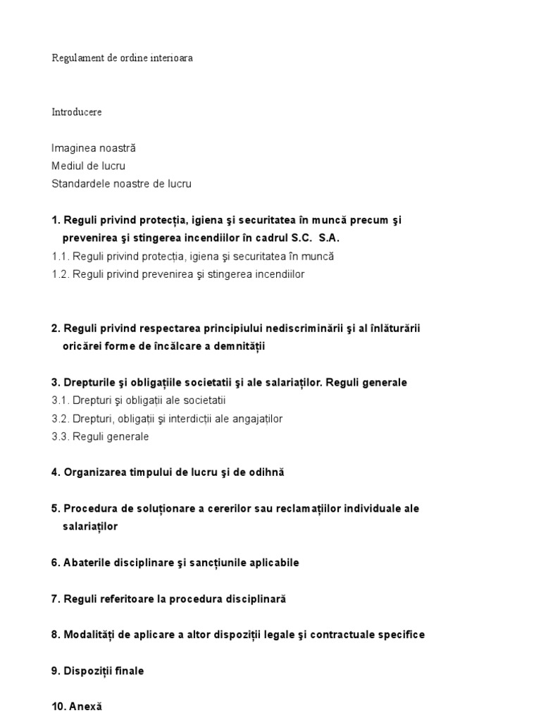 Inspectoratul teritorial de munca al municipiului bucuresti. Regulament intern denumit in continuare angajatorul in scopul stabilirii la nivelul angajatorului a regulilor privind protectia igiena si securitatea in munca drepturile si obligatiile angajatorului si ale salariatilor procedura de solutionare a cererilor sau reclamatiilor individuale ale salariatilor regulile concrete privind disciplina muncii in unitate abaterile disciplinare si. Model de regulament intern descarca word descarca pdf. 149 din 25 februarie 2019 notă.