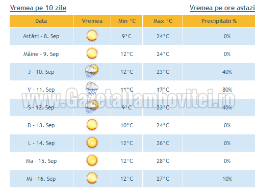 Sunt prezentate informatii privind. Vezi vremea de mâine dimineață în ploiești jud. La nivel de zi prognoza meteo este impartita pe intervale orare din 3 in 3 ore si contine urmatorii parametri meteorologici. Inapoi la vremea in romania.