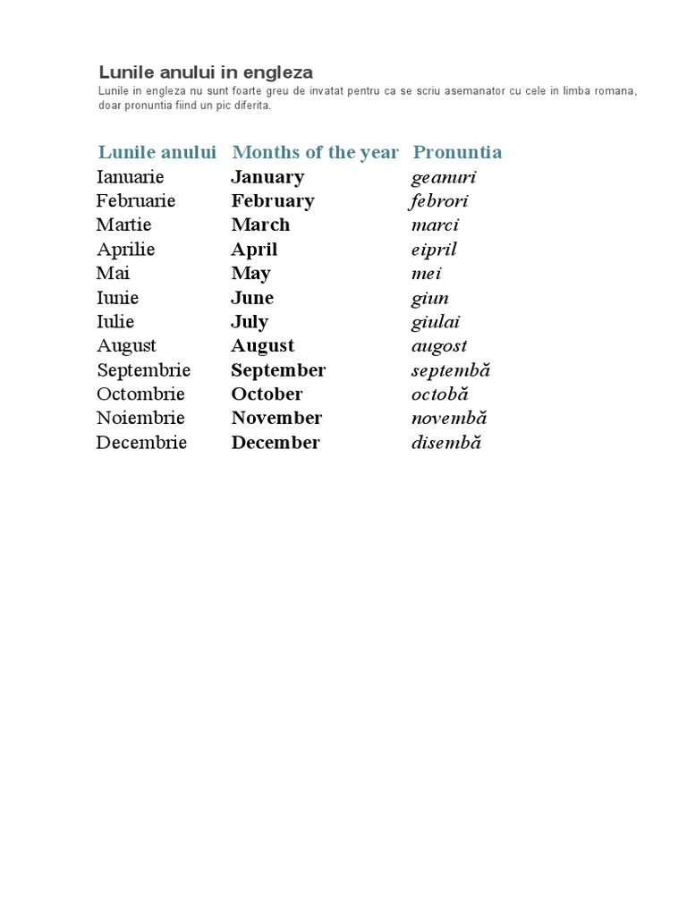 Zilele saptamanii in engleza sunt dupa cum urmeaza. Pagini din categoria lunile anului în engleză următoarele 13 pagini se află în această categorie dintr un total de 13. Zile si anotimpuri in limba engleza. Zilele saptamanii lunile anului si anotimpurile ne sunt de folos atunci cand exprimam data in limba engleza sau cand localizam un eveniment sau o actiune in timp pentru a face o rezervare la un hotel sau a cumpara bilete de avion de exemplu.